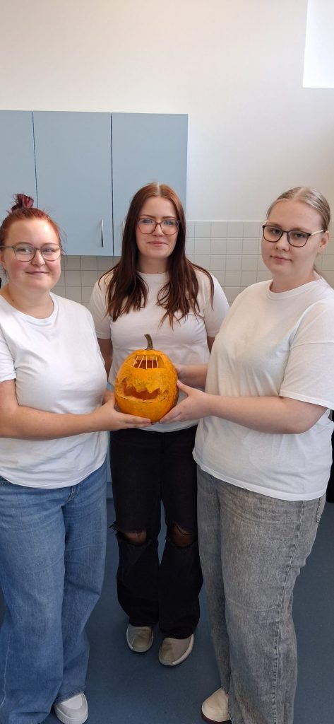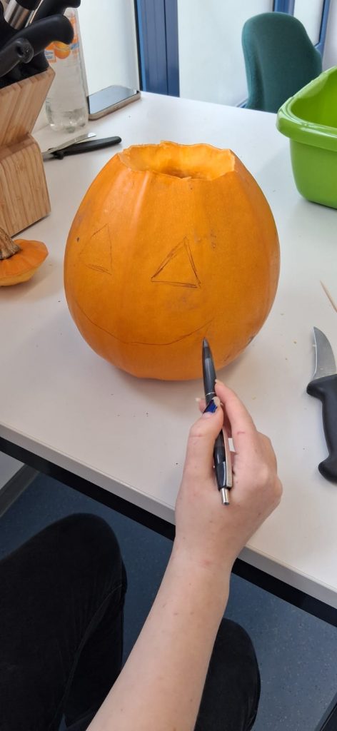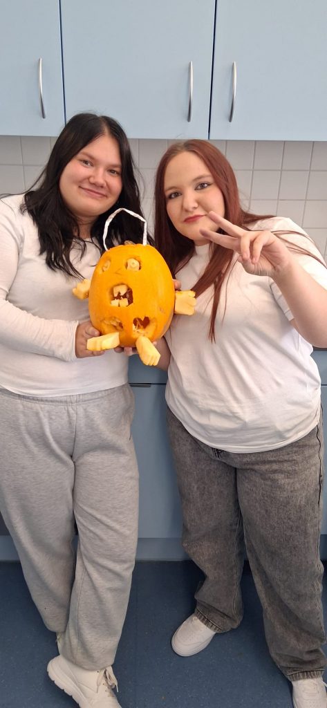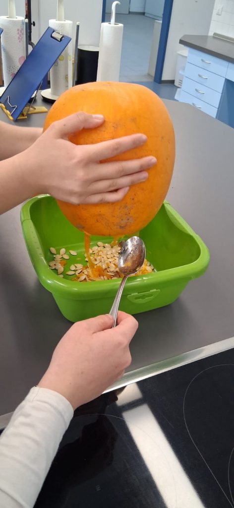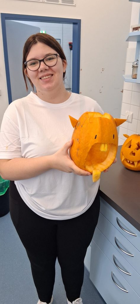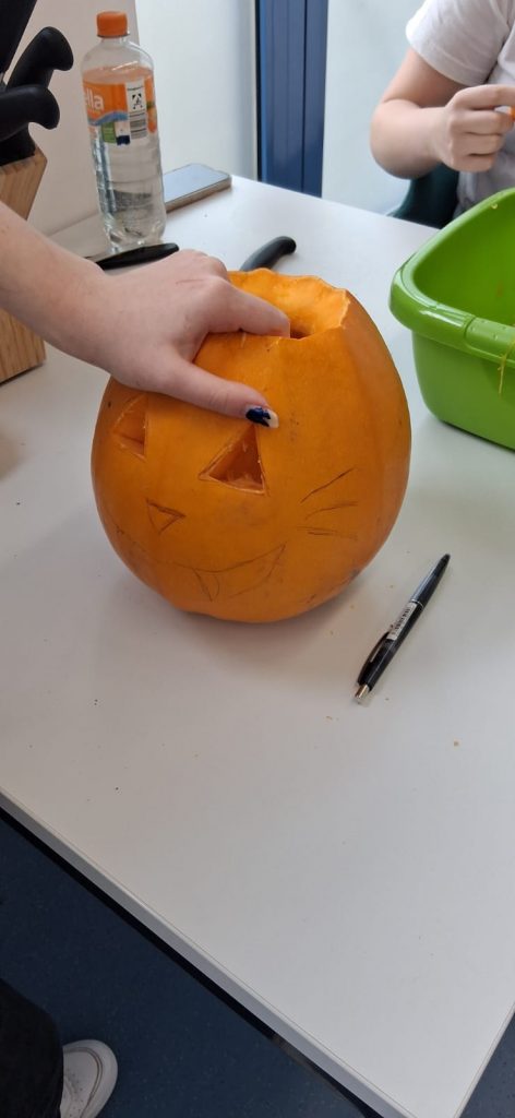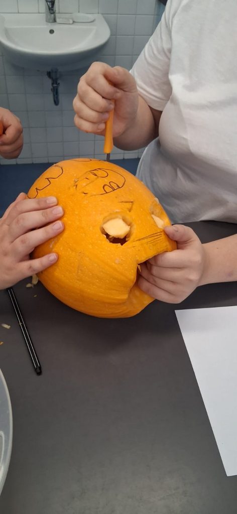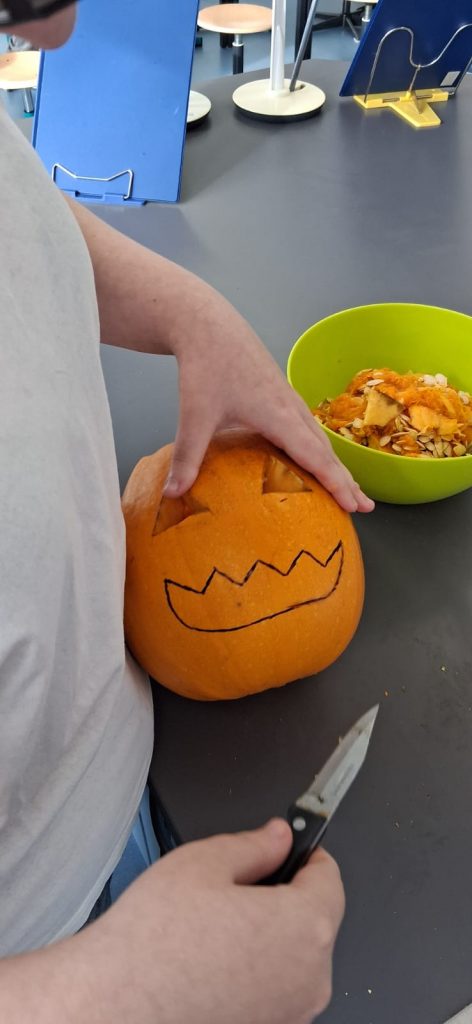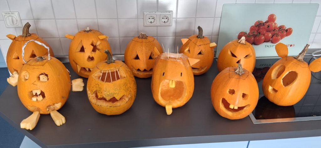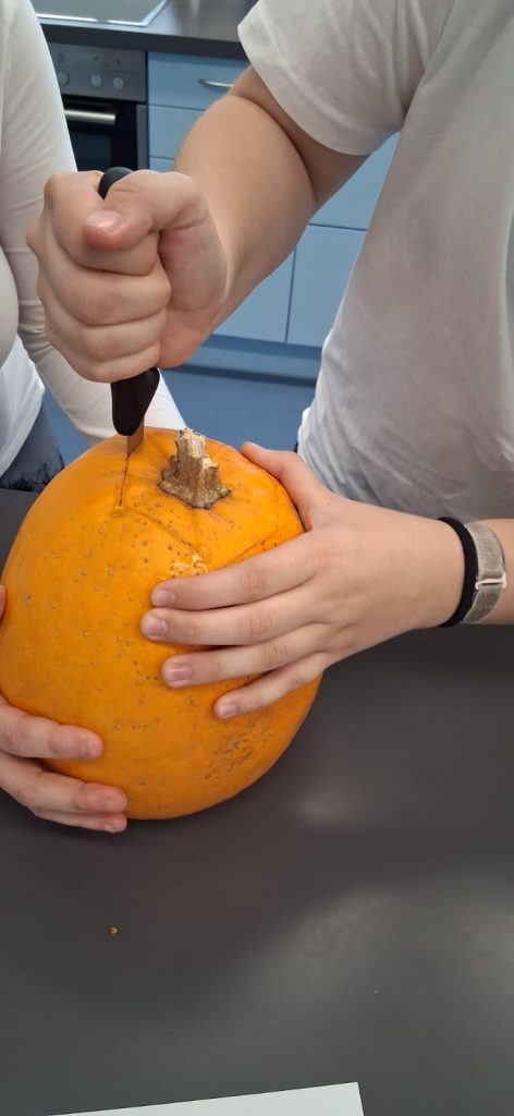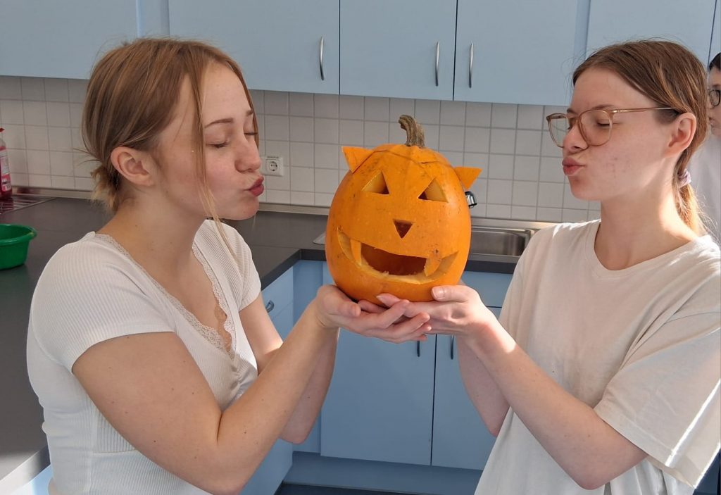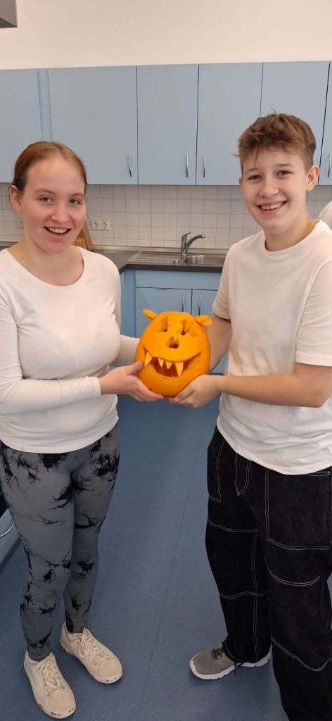 Die Schülerinnen und Schüler haben zunächst Skizzen entworfen, diese auf die Kürbisse übertragen und sie anschließend ausgehöhlt und geschnitzt – ein echtes Klassenprojekt über zwei Unterrichtsblöcke, das Kreativität, Zusammenarbeit und handwerkliches Geschickt vereinte.