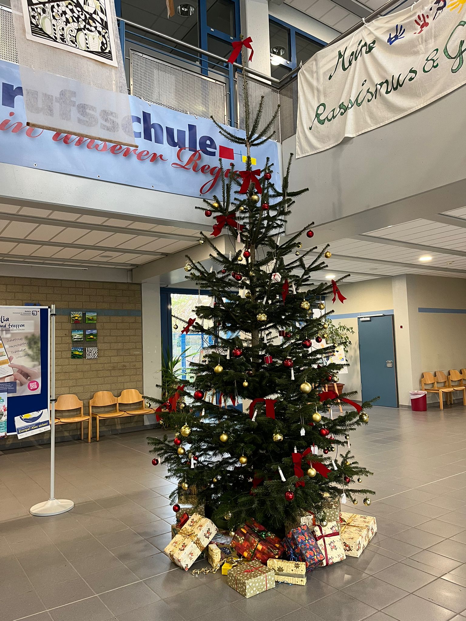 In unserem Schulgebäude hält die Weihnachtszeit Einzug. Im Foyer steht nun der festlich geschmückte Weihnachtsbaum und sorgt für stimmungsvolles Licht. Gleichzeitig laufen die Vorbereitungen für den Weihnachtsmarkt am 14.12.25 auf Hubertus Höhe auf Hochtouren: Unsere frisch gefertigten Advents- und Weihnachtskränze warten darauf, entdeckt zu werden. Mehr dazu auf der Insta Seite unseres Fördervereins: [Klick!]